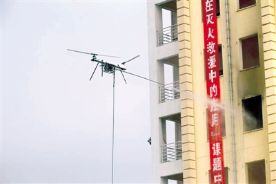 高層建筑滅火救援困難是公認(rèn)的世界性難題。“旋翼無人機(jī)在滅火搶險救援領(lǐng)域中的應(yīng)用”項(xiàng)目,運(yùn)用專門研發(fā)的大載荷工業(yè)級無人機(jī)和現(xiàn)代滅火技術(shù),搭載超細(xì)干粉和水基高效滅火藥劑,在撲救百米內(nèi)高層建筑室內(nèi)空間火災(zāi)方面表現(xiàn)出靈敏的控制響應(yīng)、穩(wěn)定的飛行表現(xiàn)和快速有效的滅火效果。